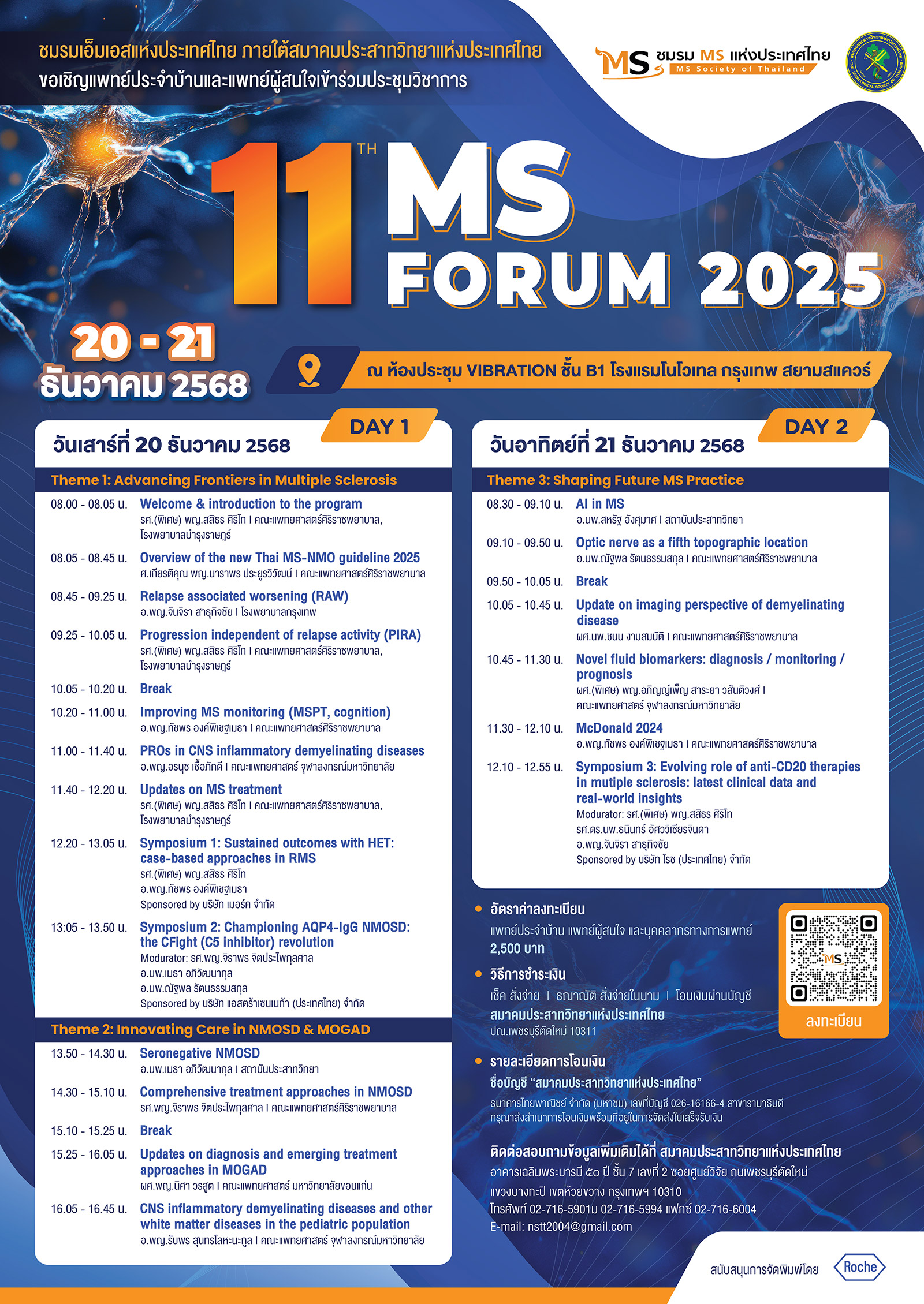 ชมรมเอ็มเอสแห่งประเทศไทย ขอเชิญชวนแพทย์สมาชิก แพทย์ผู้สนใจ และบุคลากรทางการแพทย์ เข้าร่วมการประชุมวิชาการ 11th MS FORUM 2025 รูปแบบการประชุม Onsite ในวันที่ 20-21 ธันวาคม 2568 ณ ห้องประชุม Vibration ชั้น B1 โรงแรมโนโวเทล กรุงเทพ สยามสแควร์ โดยการประชุมนี้มีเนื้อหามุ่งเน้นเกี่ยวกับกลุ่มโรคปลอกประสาทเสื่อมรวมทั้งครอบคลุมถึงความเจริญก้าวหน้าทางวิชาการอื่นๆ ที่เกี่ยวข้อง